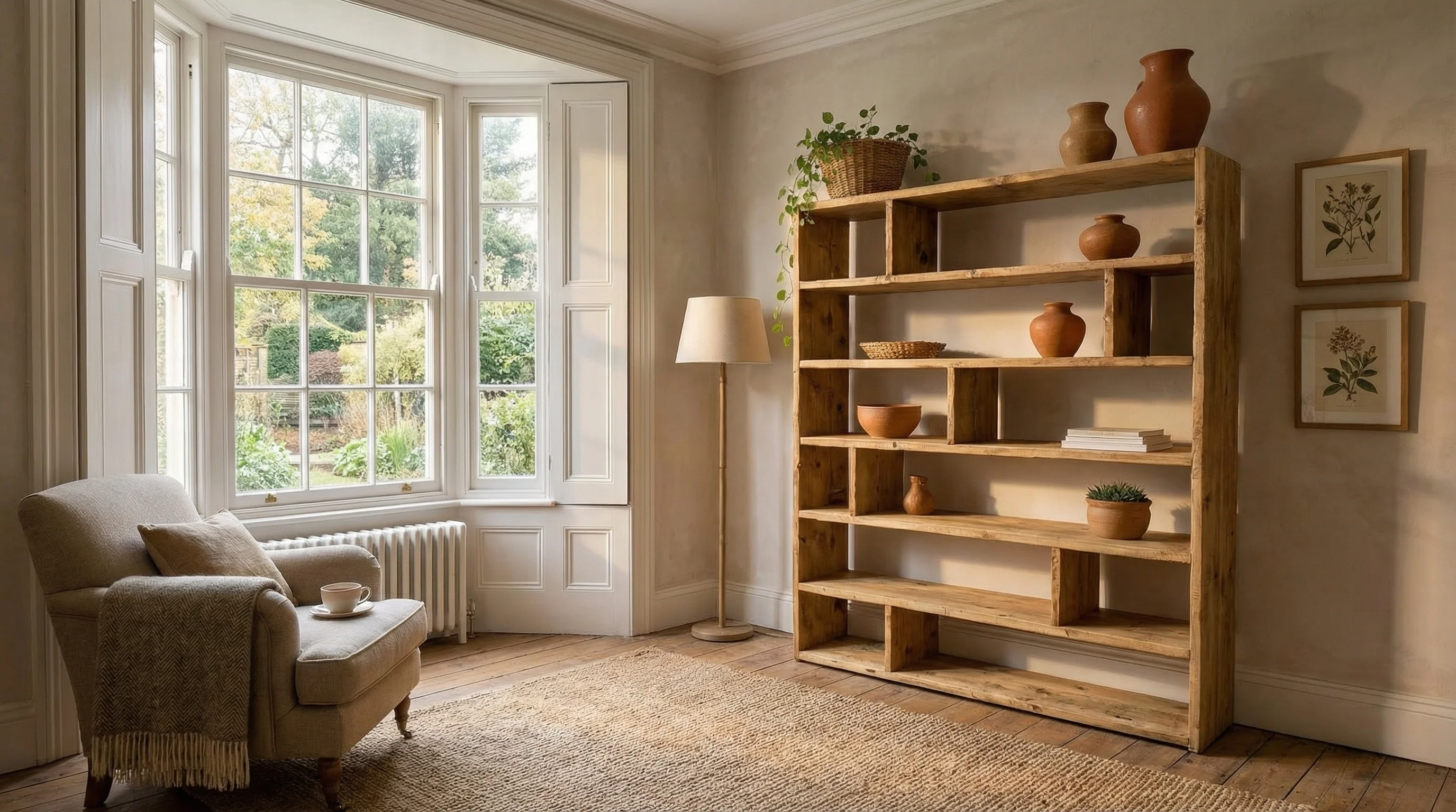 I create chunky, rustic - yet stylish - shelving units from reclaimed scaffold board timber. The piece pictured was custom fit to a bookcase, but I can also make standalone pieces.